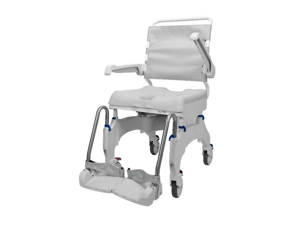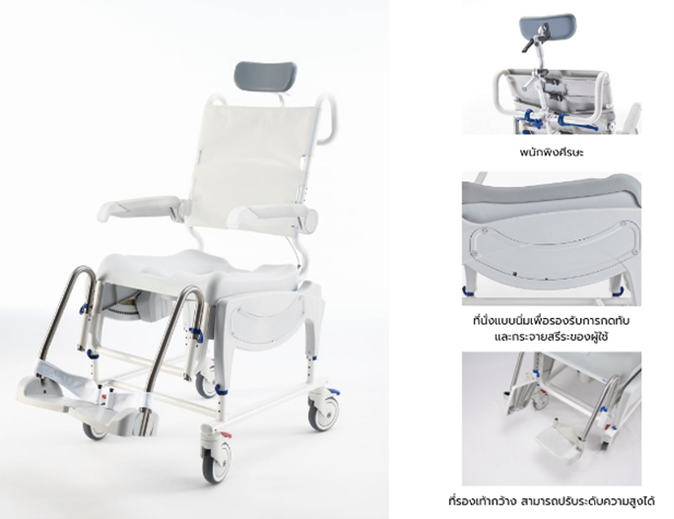 เก้าอี้อาบน้ำ ยี่ห้อ Invacare รุ่น Ocean Ergo เป็นเก้าอี้อาบน้ำที่มาพร้อมเบาะรองนั่งสุดนิ่ม ช่วยลดอาการกดทับ สามารถกระจายตัวตามสรีระของผู้ใช้ได้ ทำให้ไม่รู้สึกปวดเมื่อย เมื่อนั่งเป็นเวลานาน โครงสร้างทำมาแข็งแรง ตัวเบาะยึดกับเก้าอี้ได้ดี สามารถยกที่พักแขนได้ทั้ง 2 ข้าง เพื่อให้เคลื่อนย้ายผู้ป่วยได้สะดวก ความสูงของพนักพิงสามารถปรับได้ 3 ระดับ มีระบบล็อคล้ออิสระ ที่จะมีที่ล็อคล้อทั้ง 4 ล้อ ใช้งานง่าย เพื่อป้องกันการลื่นไหลได้ดี สามารถรองรับน้ำหนักผู้ใช้ได้สูงสุดถึง 150 กิโลกรัม มีกระบะมาให้ในตัว สามารถถอดออกไปล้างได้